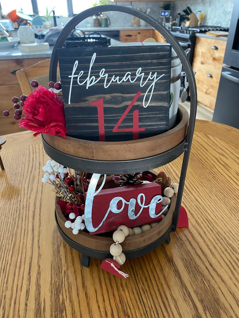 All the wood pieces on this display including the wood beads and hearts are custom made along with the February 14 sign — help your significant other remember the date (wink wink).